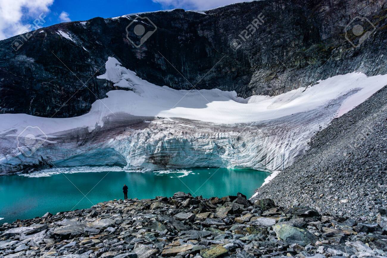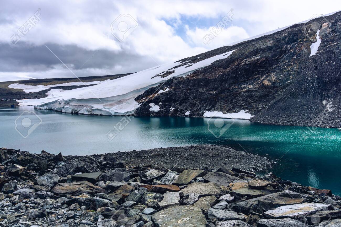 Jotunheimen Nationalpark Gletscher / Glacier Melting In Norway Global Warming Effect On Cold Environment Jotunheimen National Park Glacial Lake In Front Of Glacier Stock Photo Picture And Royalty Free Image Image 122181732